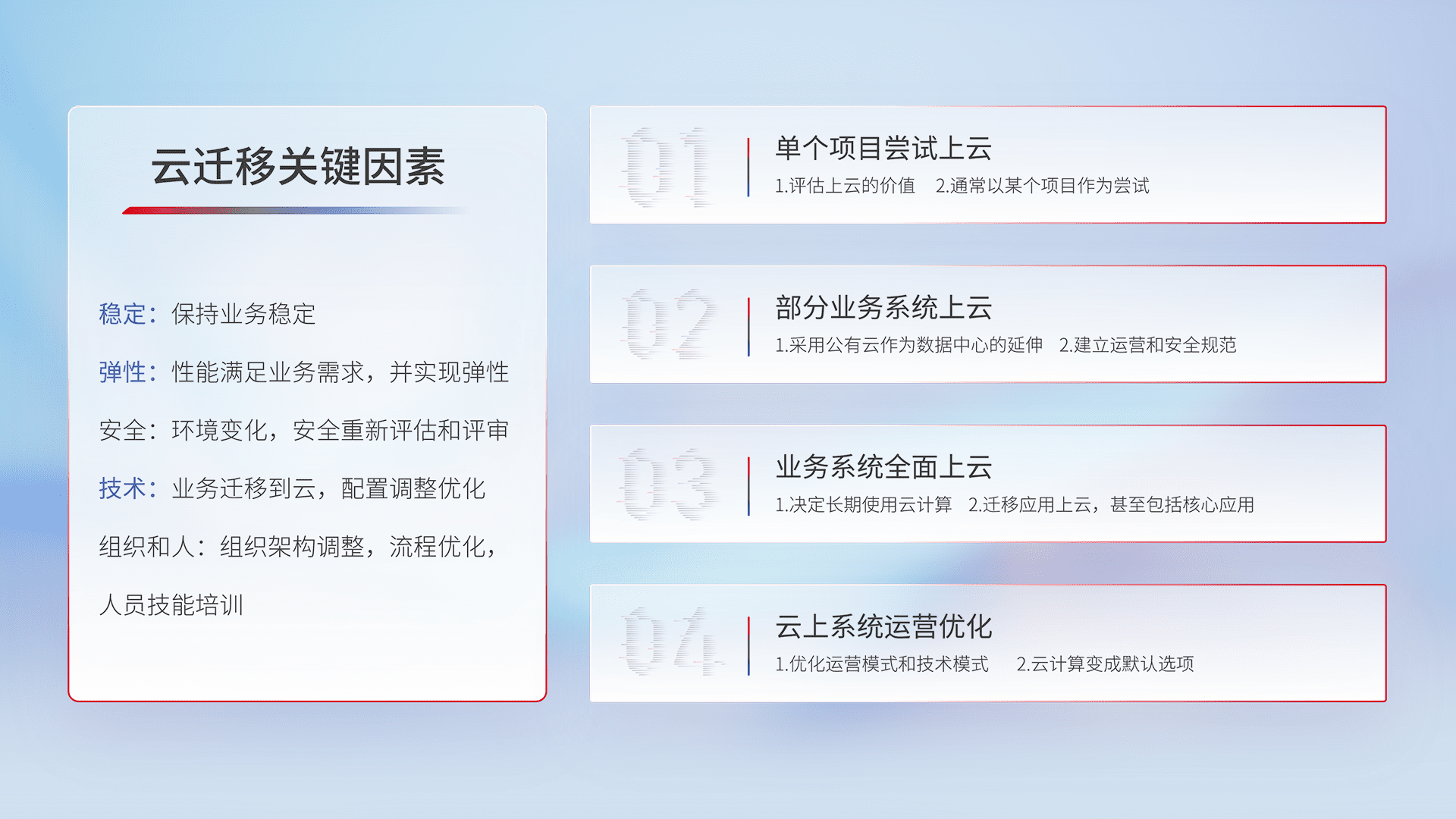 结合实际业务,,,,从规划设计、、、、云平台选型、、云原生改造、、、、数据迁移、、、集成交付,,迁移全过程为客户识别最佳上云路径,,,做好风险识别管理,,,设计网络架构、、、身份权限、、安全审计合规、、、操作审计、、、日志审计、、、、监控告警策略、、、多站点容灾设计等,,对云上基础设施进行整体规划,,,,提升IT治理水平,,,,以满足弹性、、、、高可用、、高性能的需求。。