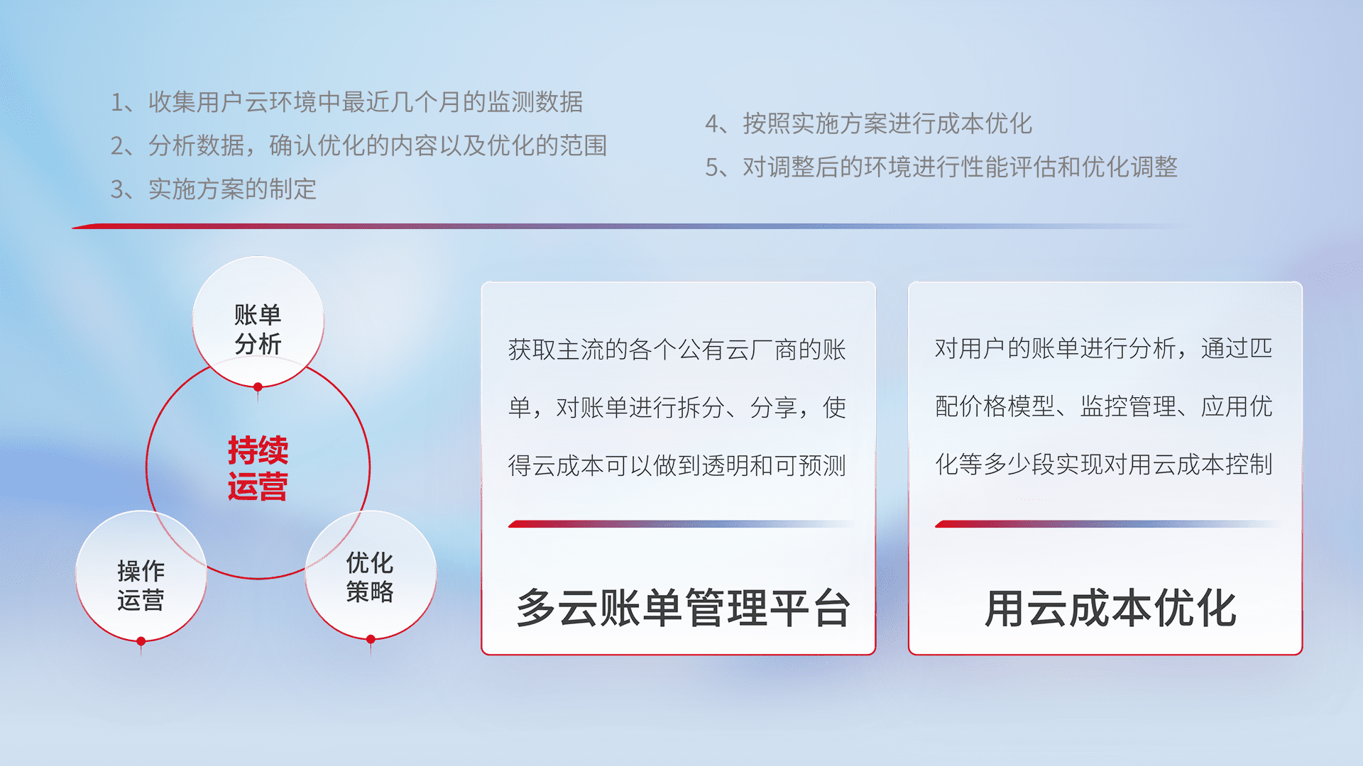 通过多云纳管,,以统一的资源数据模型把客户的云资源进行抽象和封装,,,进而实现对多云资源的统一操作,,,,保障云资源管理的可靠性、、稳定性与可用性。。。。量身定制化运维内容,,配置、、、开发运维、、补丁管理、、、、备份、、、监控、、认证和访问管理、、、审计和日常巡检等,,,保障在用云过程中的可靠度,,稳定度以及高可用率。。