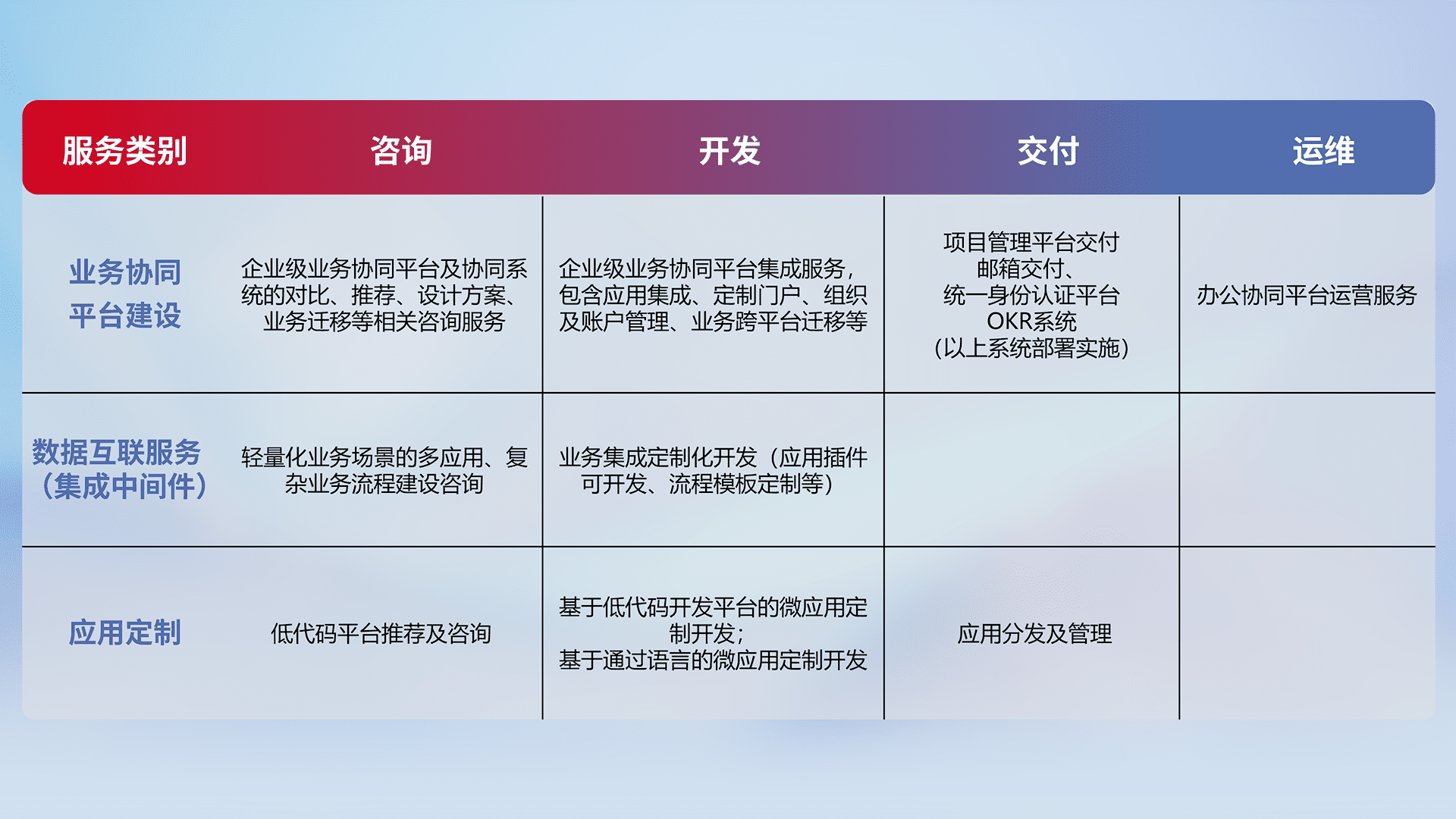 针对钉钉、、、、企微、、、IDaas等平台级产品提供产品的规划、、方案、、、交付、、、定制化开发等服务,,,实现如统一协同办公、、、、智能客户服务、、、混合会议管理、、、、智能数据查询、、等业务场景,,实现数字化转型。。。。